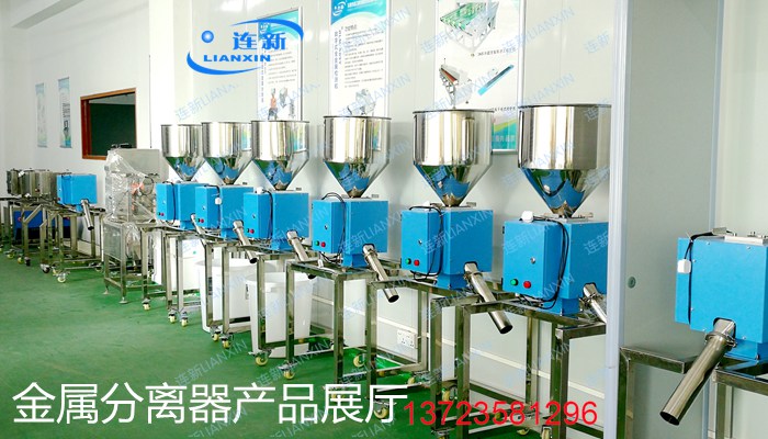 原料從料斗或送料器自由下落進入金屬分離器,如果沒有金屬雜質,原料會直接通過金屬分離器流向下端的出料口。如果檢測器檢測到原料中含有金屬,那么控制器立刻啟動分離板將金屬物和部分原料一起導向側面的排料口,然后分流板迅速恢復至正常的位置,分流板速度可調,金屬分離器的檢測精度也可根據生產需要調節,最小可檢測并分離出Φ 0.2mm的金屬顆粒。
