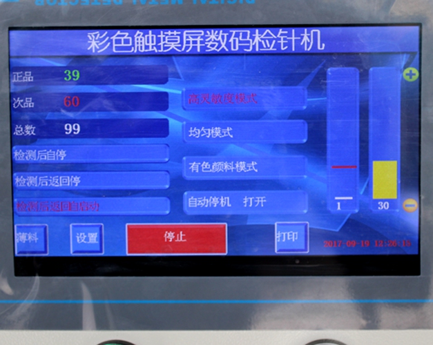 彩色觸屏式檢針機(jī),采用7寸觸屏控制,中英文操作菜單,具有三種常用檢針機(jī)功能:高靈敏度模式、均勻型模式、有色顏料模式。適合多種產(chǎn)品檢針作業(yè)!